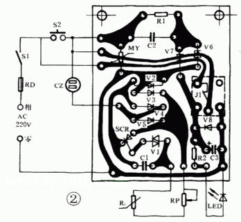 Rt是一种正温度系数热敏电阻,其内部阻值大小随所感受的温度高低而变化,即温度高时内部阻值增大,反之亦然。由整流二极管V2~V5、单向可控硅SCR、双向触发二极管V1、正温度系数热敏电阻Rt、电容C1、电位器RP组成电热毯恒温控制电路。其控制过程是:交流电经V2~V5桥式整流后变为直流电,经RP、Rt向C1充电,当C1两端上的电压达到一定值,使双向触发二极管击穿导通而处于放电状态。此时,单向可控硅被触发导通,使电热毯通电工作。在电热毯内部温度上升到一定值时,其热敏电阻Rt内部阻值很大,而降落在C1上的电压较小,不能使V1击穿,则SCR关断,相应电热毯断电不工作,此时电热毯处于降温状态。当电热毯温度降到某一值时,又重复以上的控制过程,这样不断周而复始,使电热毯温度保持在某一恒定值。倘若电网出现过电压时,压敏电阻MY内部被短路(即处于导通状态),并快速熔断保险丝RD,从而起到过电压自动保护作用。图2是该装置的印刷线路板装配图。