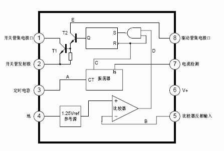 贴片34063,SOP-8脚。 1. MC34063 DC/DC变换器控制电路简介: MC34063是一单片双极型线性集成电路,专用于直流-直流变换器控制部分.片内包含有温度补偿带隙基准源、一个占空比周期控制振荡器、驱动器和大电流输出开关,能输出1.5A的开关电流.它能使用最少的外接元件构成开关式升压变换器、降压式变换器和电源反向器. 特点: *能在3.0-40V的输入电压下工作 *短路电流限制 *低静态电流 *输出开关电流可达1.5A(无外接三极管) *输出电压可调 *工作振荡频率从100HZ到100KHZ 2.MC34063引脚图及原理框图  3 MC34063应用电路图: 3.1 MC34063大电流降压变换器电路